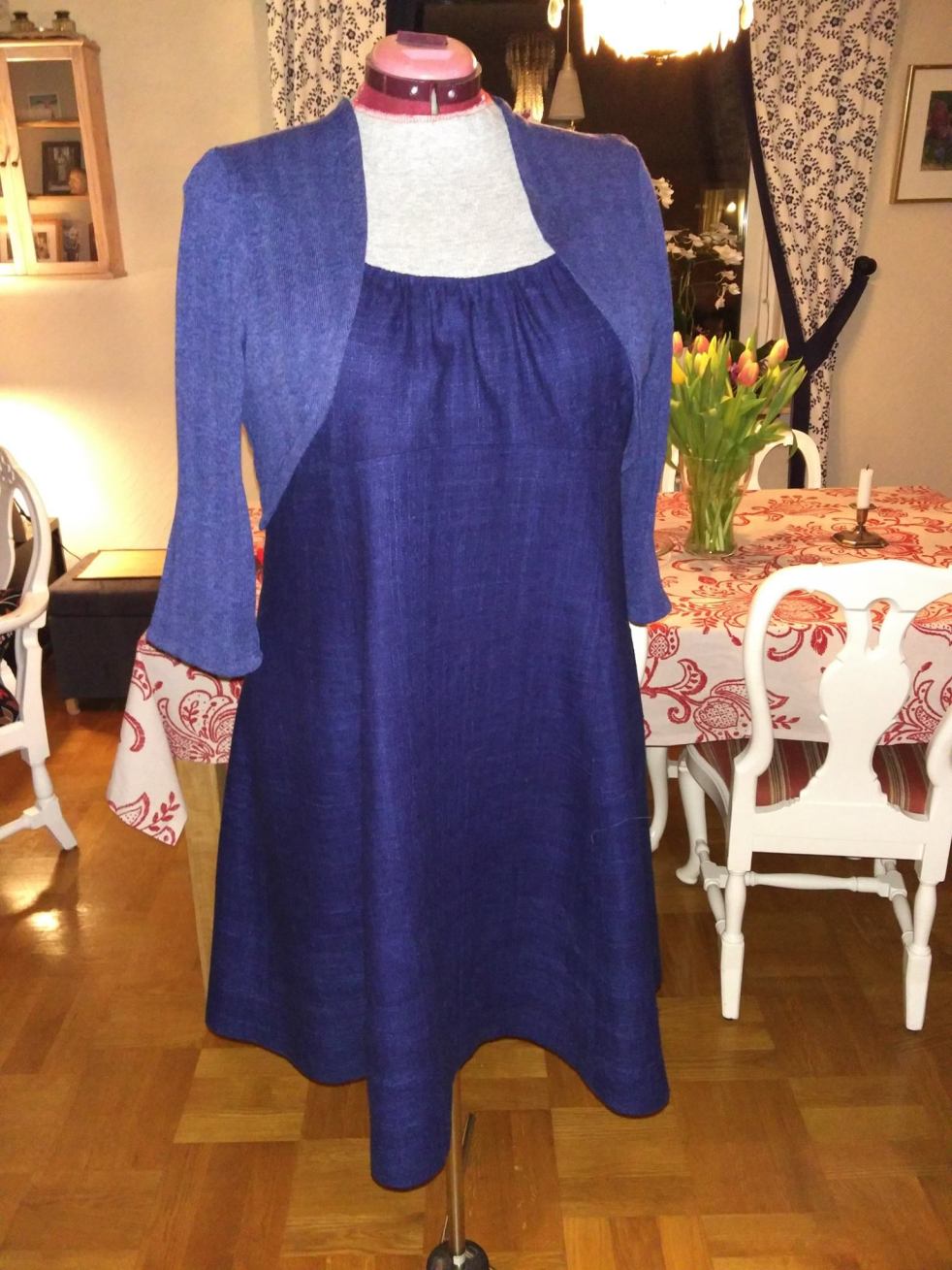 I januari 2013 besökte jag och min man en lite udda butik med presentartiklar i nordvästra Skåne. Längst inne i butiken hittar jag en del tygrullar varav ett flertal var i råsiden i härliga färger. Jag kunde inte låta bli utan köpte två olika blå och ett i orange. Två meter av varje färg, det var ju inte på fullbredd. Det klarblå blev en liten kavaj med skört, det i orange blev en klänning men det mörkare blå fastnade, det fick ligga kvar. Nu, 2017 i mars fyllde maken 50. Han älskar just den blå färgen, så nu äntligen har jag använt det vackra tyget. Ett tyg jag fyndade för 200 kronor blev en lyxig klänning. Lite lyx är det ju faktiskt att få skapa och sy sina kläder. Visst har det krävts mycket träning och allt har inte blivit helt lyckat genom åren… men det är nog då jag lärt mig mest, då när allt bara gått emot.