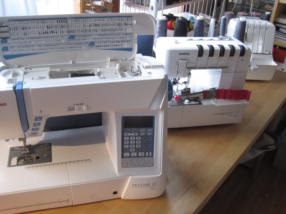 - Cover/top cover/täcksömsmaskin ja, det är lite lyx, men det blir så fint! Alla fållar i trikå blir hållbara och snygga. Top covern dekorerar dessutom sömmen lite extra. Cover+bandkantare är verkligen en tillgång om du syr mycket barnkläder. (I mitten ovan)