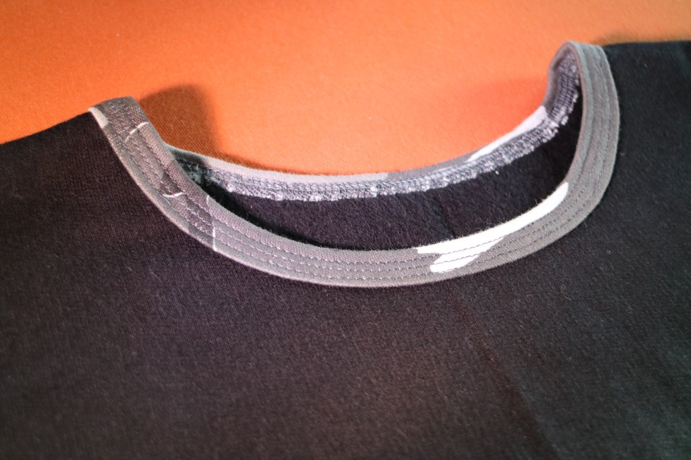 Denna lilla film är främst gjord för att visa hur enkelt det är att sy med en bandkantare och en cover. Jag har visserligen en cover med top-tråd på, men jag varierar, ibland syr jag med och ibland utan top-tråd. Denna gång blev det med tre parallella sömmar istället. Det jag vill visa är också hur jag får till en jämn snygg halsringning som inte yvar utåt samt hur jag syr ihop skarven fint. Jag sydde i ganska tunt joggingtyg och bandet har jag skurit själv av rester i tunn interlock och är 35 mm brett.