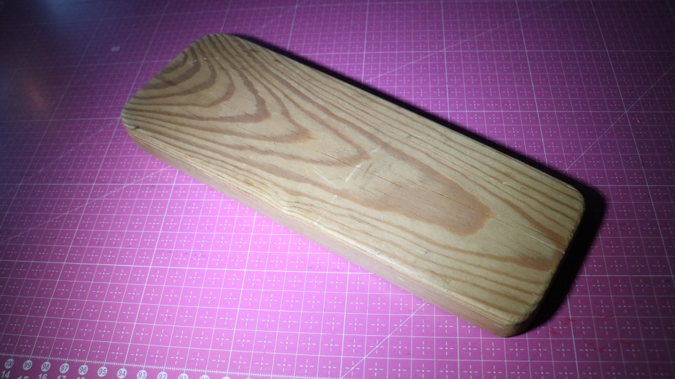 Pressklampen gör du lätt själv av en träbit. Storleken är inte så viktig, det är dock viktigt att kanterna är väl sandpapprade så att de inte fastnar i tyget. Du ska inte ytbehandla den, låt den bara vara naturell. Min har hållit fint i 35 år!