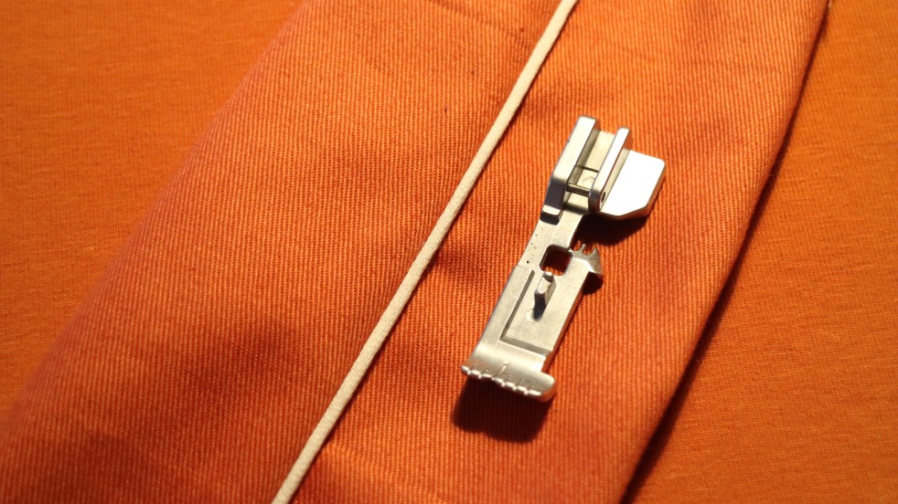 Nu har jag kommit fram till tredje filmen i min serie med pressarfötter. Denna gång är det en specialfot till att sy fast passpoalband (pipingband). Att sy fast passpoaler i sömmar har aldrig varit så enkelt som med en sån här pressarfot. Den finns till de flesta overlocksmaskiner. Detta är en av de allra mest lättanvända specialfötterna, tycker jag. Så enkelt och så fint!