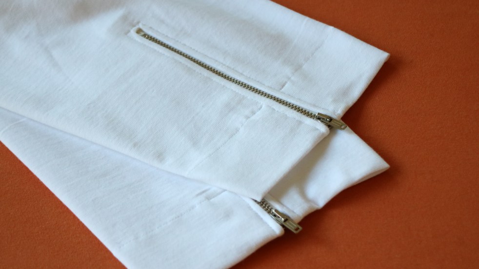Idag när jag skulle sy ett par korta vita tights så var jag rädd att de skulle se ut som pyjamasbyxor om jag bara sydde dem efter mitt gamla vanliga mönster. Så jag bestämde mig för att sy dit dragkedjor i sidorna nertill, jag tycker att det är så fint. Efter lite letande i mina gömmor hittade jag två lika dana dragkedjor av dålig kvalité, de saknar nämligen mekanismen som gör att en dragkedja i ett par byxor inte åker ner direkt. Detta blir perfekt, tänkte jag, för här har ju detta ingen betydelse. Jag älskar när jag kan ta till vara gammalt material som legat länge i gömmorna. Det blev ett par härliga korta somriga tights!