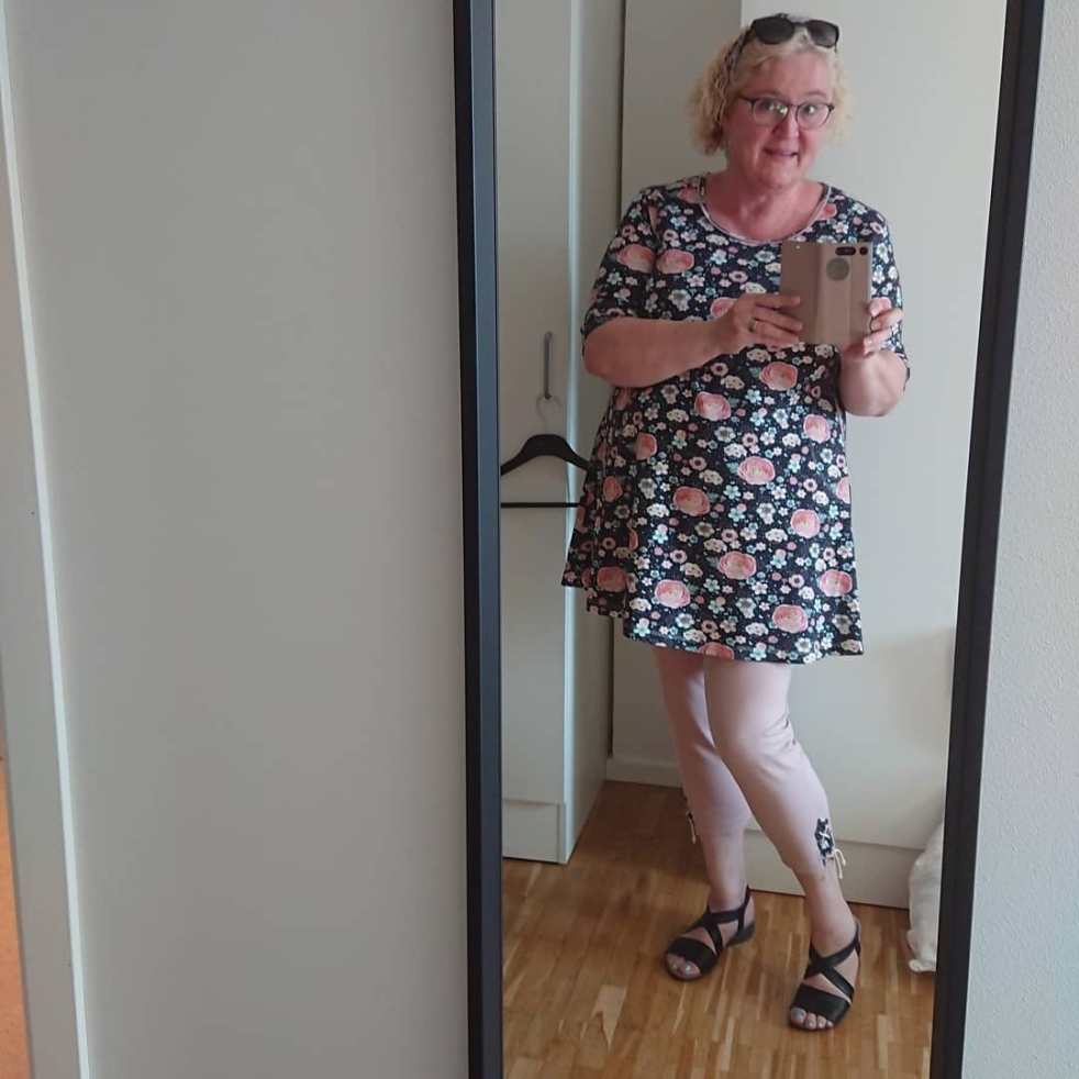 Det är lite kul att gå på uppvaktning i matchande hemsydda kläder. Här har jag en riktigt somrig blommig tunika som jag bär för första gången och som jag matchar med diskreta vadlånga tights. För att fånga upp tunikans mönster så har jag gjort en snörning nertill på tightsen och för att matcha tightsen så har jag använt den blekrosa trikån i den dubbla bandkantaren. Hur du syr den fina snörningen på benet hittar du här nedan. Självklart kan du sy korta knapphål eller använda öljetter i metall om du inte har automatiska snörhål på din symaskin. Jag gillar snörning som dekor på byxben, så det lär nog bli några tights till!