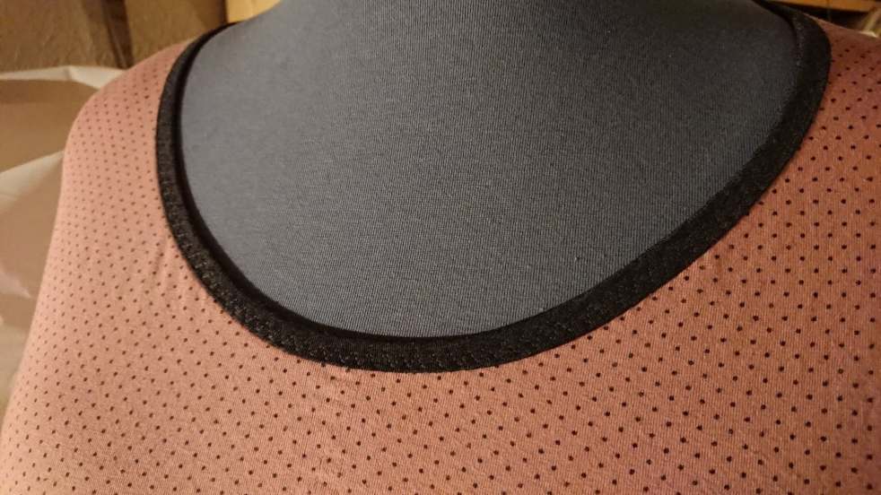 Jag har ett nattlinne/pyjamas som jag aldrig trivts i på grund av att halsringningen var för hög i halsen, inte alls skönt när jag ska sova. Nu har jag äntligen tagit tag i det och klippt en ny halsringning och bandkantat den. Jag har bandkantare, ja flera stycken faktiskt, men nu sydde jag kanten på det gamla vanliga sättet på vanlig symaskin. Jag blev nästan förvånad själv hur snabbt och enkelt det är att bandkanta ‘förhand’ på vanlig maskin. Jag sydde stickningen med trestegssicksack och jag tyckte att det blev riktigt fint. Har du inte någon bandkantare? Då tycker jag att du ska kolla denna filmen!