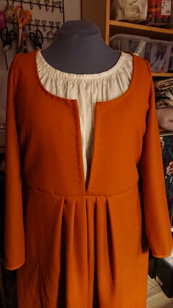Jag köpte ett härligt orange ylletyg på Korps på mässan i Stockholm. Nu har jag först ritat mönster, sytt en toile (ett testplagg i enkelt tyg) och nu äntligen vågat att sätta saxen i tyget och börjat att sy en 1400-tals-klänning att ha på medeltidsevent. Det är så roligt att utmana sig själv. I halsen ska den fina särken synas med sin klassiska smock. Framtill ska den snöras, men det dröjer innan jag kommit så långt. Jag har fått fina tips av Anna Malmborg som skrivit handböcker om historiska klädedräkter från 1400-talets senare del.