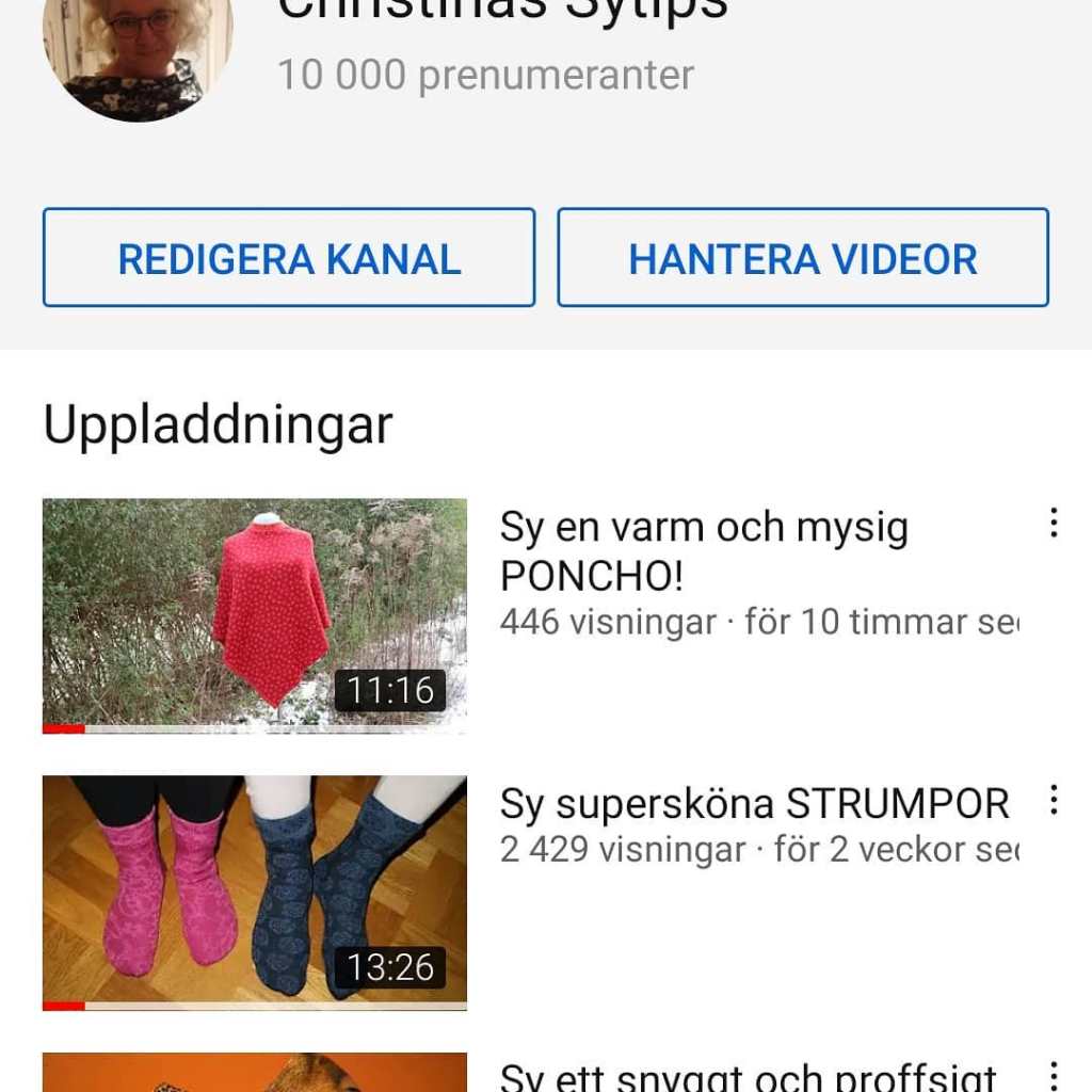 Idag firar jag tillsammans med min man att Christinas sytips nu har hela 10 000 prenumeranter! Det är nästan 4 år sen jag startade Youtubekanalen och då startade jag med en liten enkel kompaktkamera. En hel del har hänt sedan den 7 mars 2017 när jag släppte den första filmen. Jag har lärt mig så mycket, men jag har ännu massor kvar att lära mig. Jag hoppas att ni alla är med mig vidare på den inslagna vägen. Har du önskemål om kommande filmer, skicka ett mejl till: christinassytips@gmail.com.